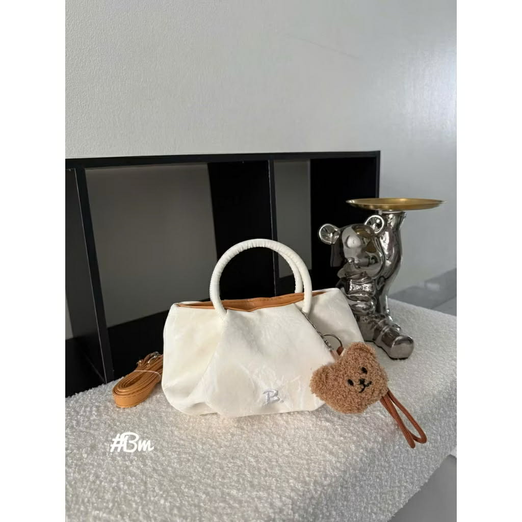 - Mô tả: Thiết kế dáng nhún mây mềm mại, có quai xách tròn và dây đeo chéo đi kèm. Điểm nhấn là móc khóa hình đầu gấu bằng lông cực kỳ xinh xắn.